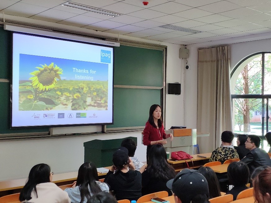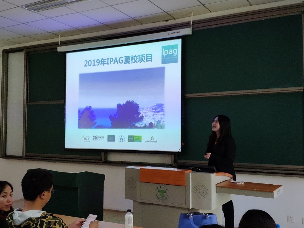 随后,来自法国IPAG商学院的倪老师对我院IPAG志愿者同学所进行的各项活动表示了感谢,并对法国与IPAG商学院的整体情况做了介绍。倪老师图文并茂地为同学们描绘了在法国生活学习的图景,详细地说明了IPAG夏校特色课程和日程安排,最后对同学们关心的生活学习费用等问题做了细致地解释。