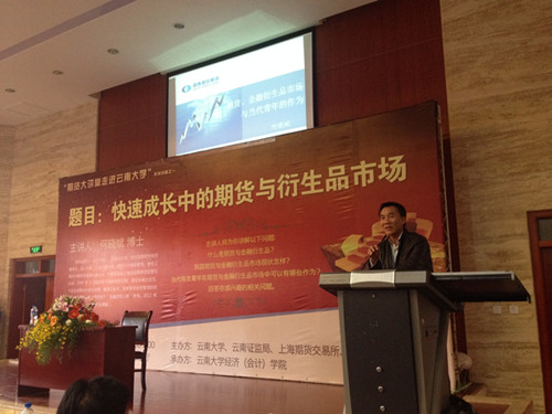 2013年10月30日下午2:30,由经济(会计)学院承办的“期货大讲堂——走进BV伟德官方网站”系列讲座第一讲在呈贡校区城建报告厅开讲,由经济学博士、高级经济师,现任国泰君安期货董事长,被上海市授予“金融领军人物”称号,2012年被评为“沪上十大金融行业领袖”的何晓斌博士担任主讲。出席本次讲座的嘉宾有上海期货交易所刘总,云南证监局相关领导,经济(会计)学院院长施本植教授,经济(会计)学院党委副书记李娟老师,经济(会计)学院团委书记丁江辉等。施院长主持了此次讲座。