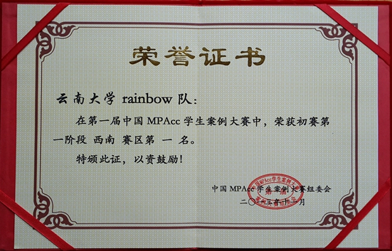 我校BV伟德官方网站(会计学院)会计硕士研究生吴丰、张佩、李沙沙、奎翔在首届中国MPAcc案例分析大赛初赛第一阶段的激烈角逐中荣获西南赛区第一名,为BV伟德官方网站争得了荣誉,为云南省争得了荣誉。
