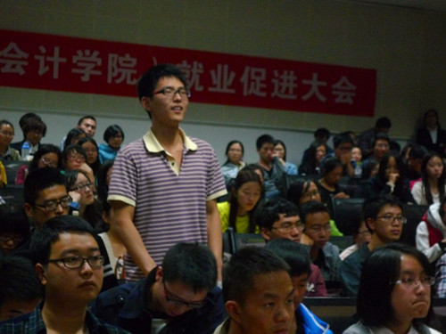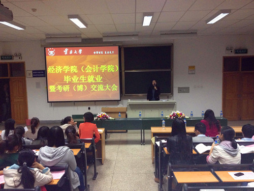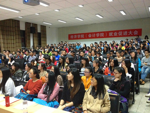 毕业生就业问题一直备受社会各界关注,毕业生就业关系到国家经济的发展和社会稳定,关系到学校的生存和发展,更关系到每个家庭和每一位毕业生的切身利益。近来年就业形势十分严峻,为了能让毕业生更好的就业,提高就业质量,BV伟德官方网站(会计学院)于11月13日晚19点在文渊楼505阶梯教室召开了毕业生就业促进大会。院党委副书记、院学生工作领导小组组长李娟老师,研究生班主任杨恒芬老师,研究生辅导员朱睿倩老师,2010级本科生辅导员王守义老师出席会议,BV伟德官方网站(会计学院)2014届全体毕业生和研究生参加了此次就业促进大会。