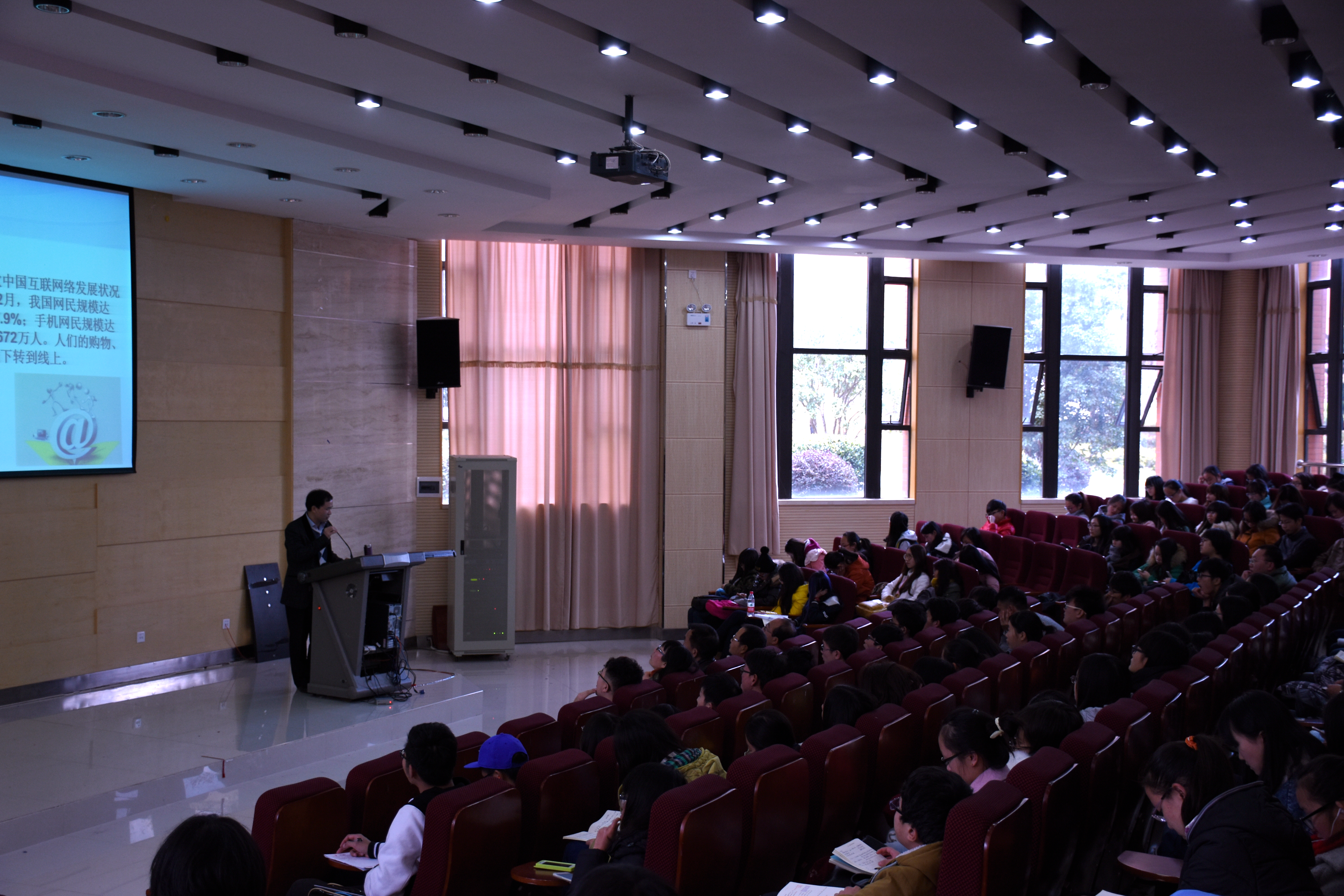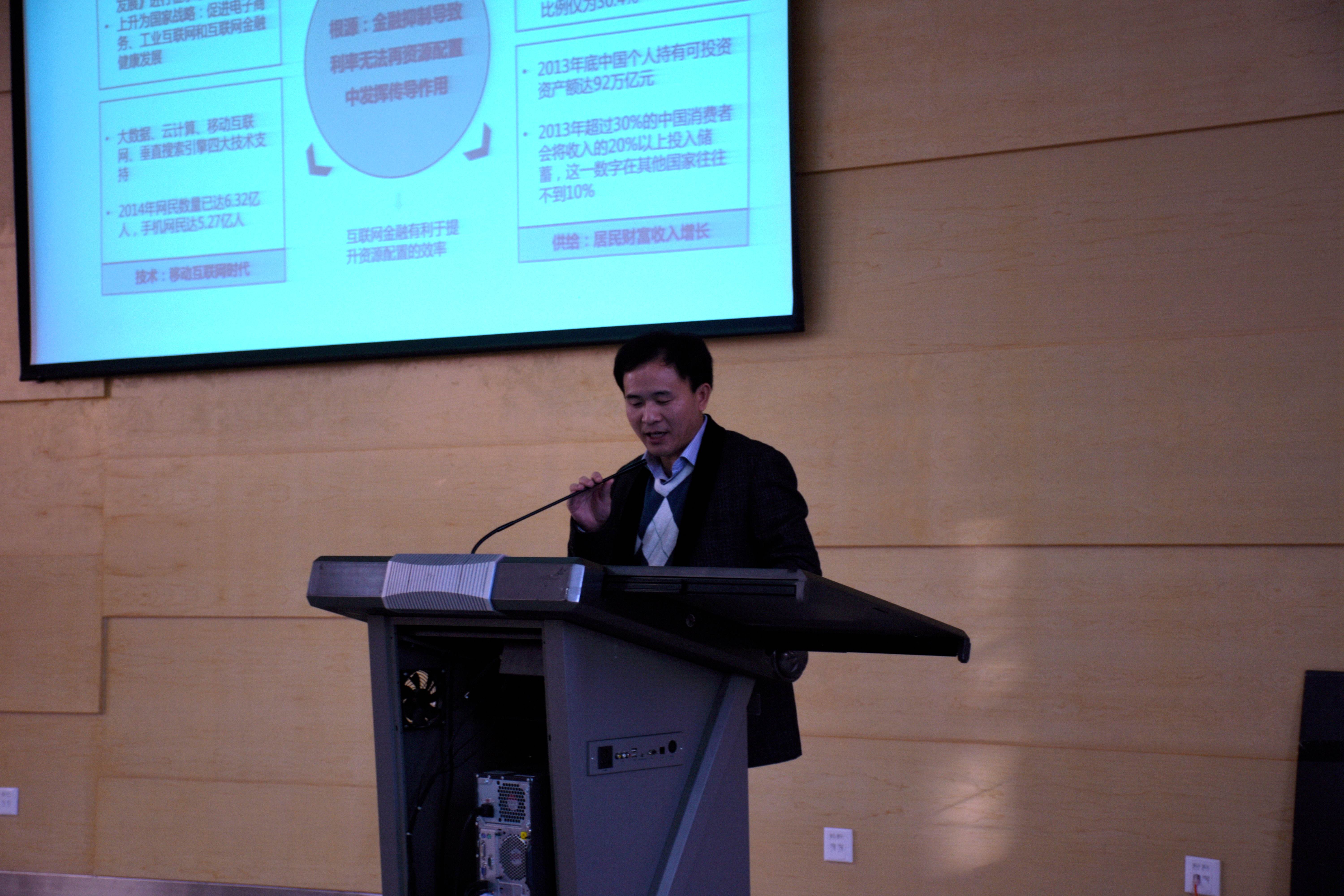 讲座在院长施本植老师的主持下开始。讲座伊始,黄英君便从经济的“新常态”谈起,以中国的互联网+模式为例,阐明了“新常态”的概念。黄英君认为,互联网技术以及小微企业的迅速发展使得互联网用户越来越广泛,随着互联网金融的发展模式多元化,支付结算,网络融资,虚拟货币等融资方式逐渐普及,以e租宝,p2p为主的互联网金融渐渐为人们所熟知。同学们在黄英君老师的讲解下,对互联网金融有了更深入的了解和认识。