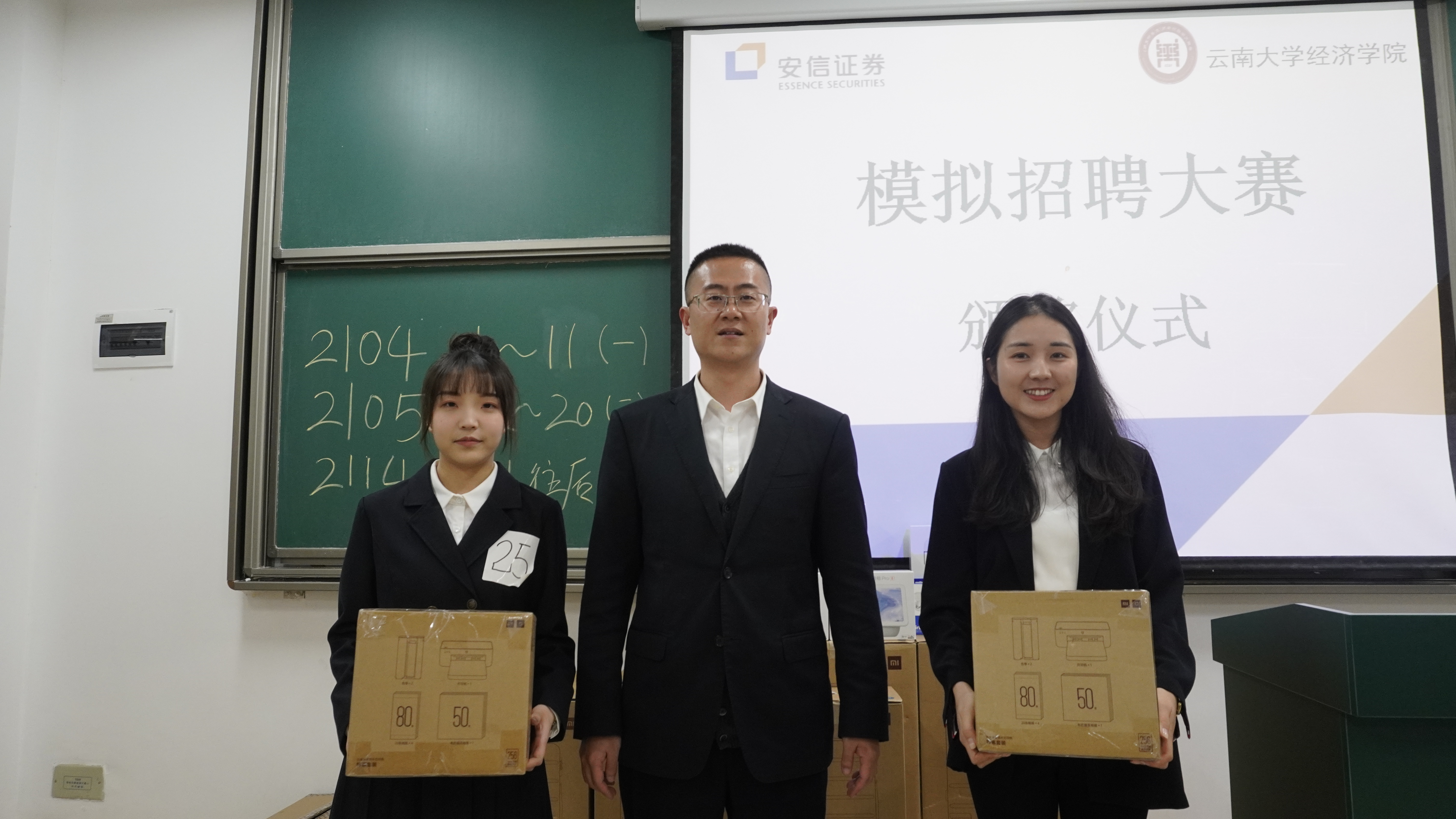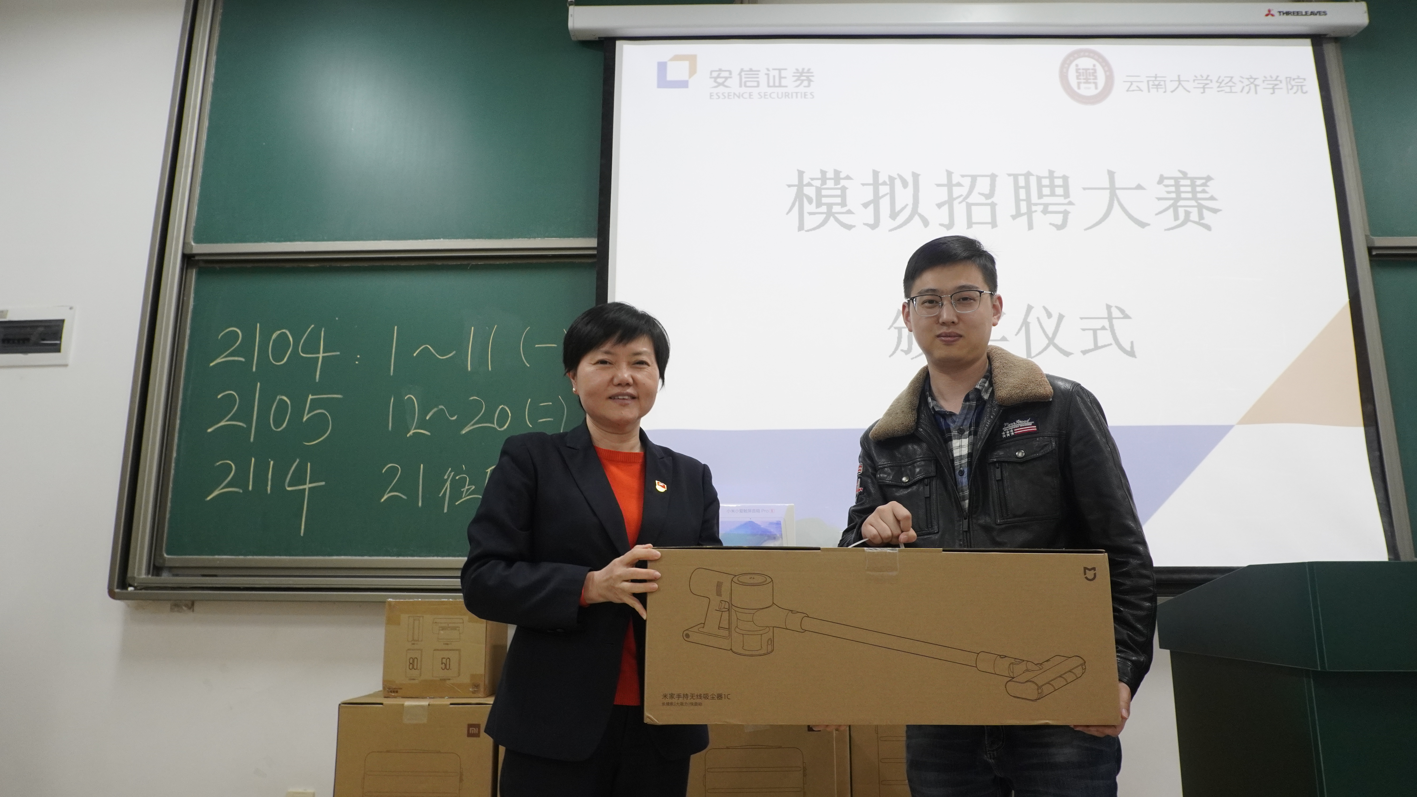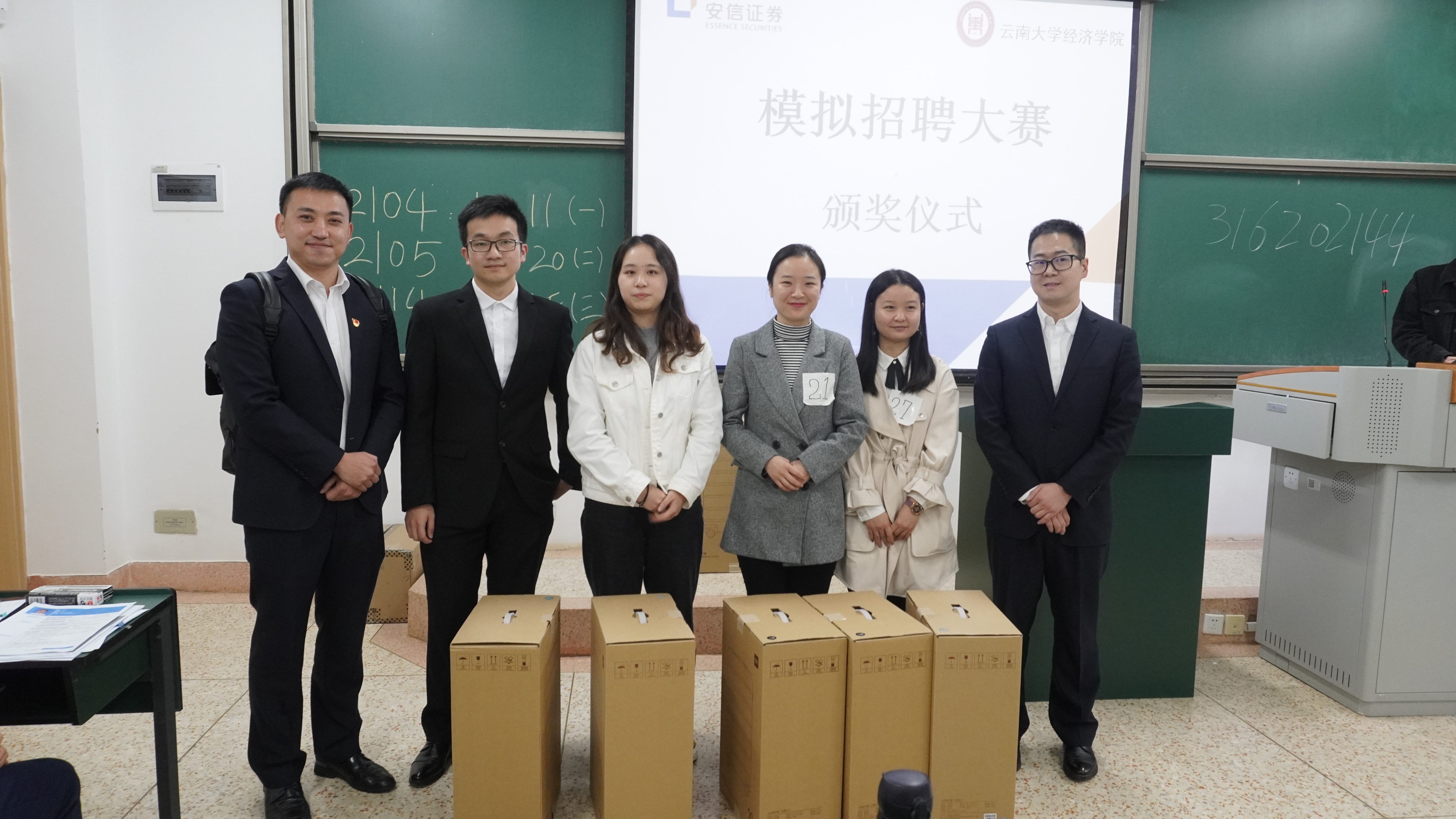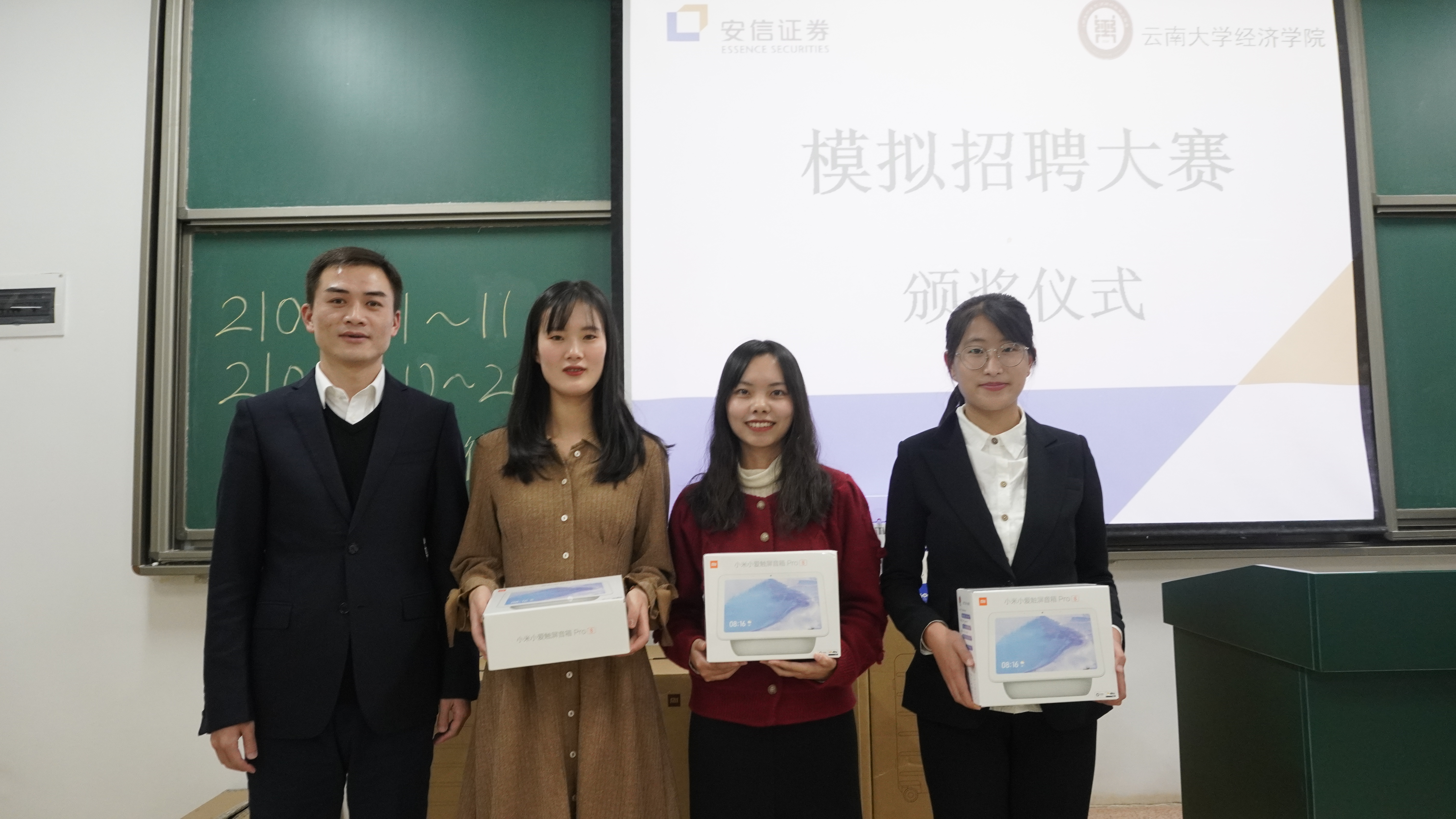 最终,根据综合得分情况,韩西成同学荣获一等奖,周铭、飞茼嘉同学荣获二等奖,李畅、陈颖、杨玲同学荣获三等奖,曾子钰、官令今、杨源媛、叶晓迪、陈燕荣同学荣获优秀奖。来自安信证券的各位老师为以上获奖同学进行了颁奖。