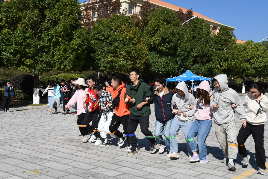 第二个项目是十人十一足,参赛过程中,各支队伍的腿绑在一起,大家上下一心,势如破竹,奋力向着终点迈去。我院每位参赛者都为了自己的目标和院集体的荣誉而拼搏着。同学们都发扬友谊第一,比赛第二的作风,从而充分的感受到了运动的乐趣。