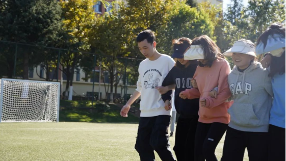 将团队小组成员的腿绑在一起,形成六人七足,出发到达指定地点后,方可通关。