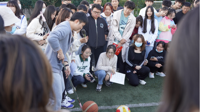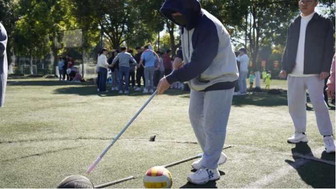 每队6名队员分散在10米开外的两侧,每名上场的队员需用棍子同时“驱赶”篮球和排球,将两个球同时运送到终点处,然后将棍子递给下一位同学,依次接力上场。