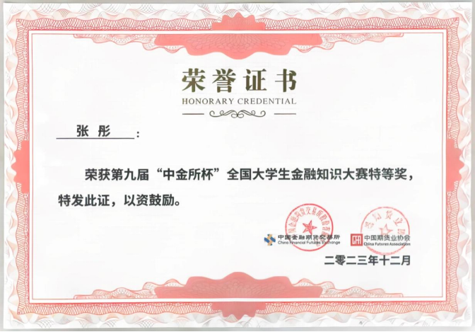 近日,第九届“中金所杯”全国大学生金融知识大赛落幕,我院首夺大赛一等奖。该项赛事由中国证监会指导,中国金融期货交易所、中国期货业协会共同主办,自2014年举办首届以来,“中金所杯”已逐步成为高校及在校大学生密切关注的金融学科顶级品牌赛事。本次比赛吸引了国内外高等院校全日制在校学生积极报名参加,经过初赛,共有6022名来自国内外知名院校的参赛者进入在全国各现场考点同步举行的复赛,我院2021级硕士张彤同学在复赛中取得优异成绩并荣获特等奖(大赛设特等奖10名,每名奖金20000元),同时也是我院学生目前在该项赛事中取得的最好成绩。