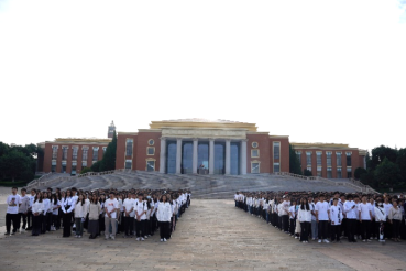 “五星红旗迎风飘扬,胜利歌声多么嘹亮,歌唱我们亲爱的祖国,从今走向繁荣富强……”,升旗仪式后,全体师生齐唱《歌唱祖国》,旋律优美激昂,节奏明快有力。嘹亮的歌声回荡在文典广场的上空,其明朗向上的旋律、深情的歌词和独特的魅力,激发着经院青年学子的爱国热情。