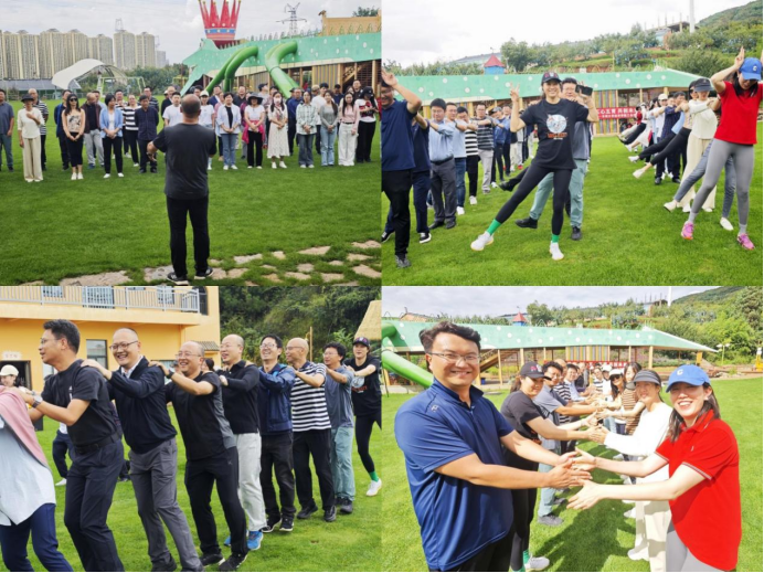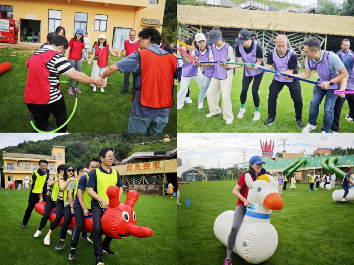 而后,分组比赛拉开帷幕,教练将教师们分成红、黄、紫、白四队,各队自行编排口号与团队形象照队形。比赛项目有:“一圈到底”,成员手拉手成圈利用身体传递小圈;“无间道”,队员将PVC管相连将乒乓球从起点运到终点的杯中,球不掉落且管不分开,否则重来;“毛毛虫竞速”,每队6名队员手提毛毛虫协调竞速;还有展现教师激情活力的“骑马”接力赛。