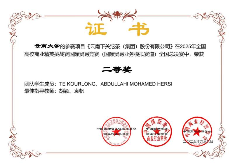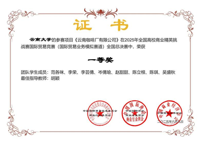 本次赛事中,BV伟德官方网站BV伟德官方网站两支团队荣获全国总决赛一等奖,一支团队获二等奖 。《云南咖啡厂有限公司》项目团队(学生成员:范各咪等;指导教师:胡颖 )、《建水阳光予你酒业有限公司》项目团队(学生成员:常双阳等;指导教师:邵素军、袁帆 )一路披荆斩棘,从众多参赛队伍里脱颖而出,摘得一等奖。《云南下关沱茶(集团)股份有限公司》项目团队(学生成员:TE KOURLONG、ABDULLAHI MOHAMED HERSI ;指导教师:胡颖、袁帆 )也实现了留学生队伍的首次突破,荣获二等奖。