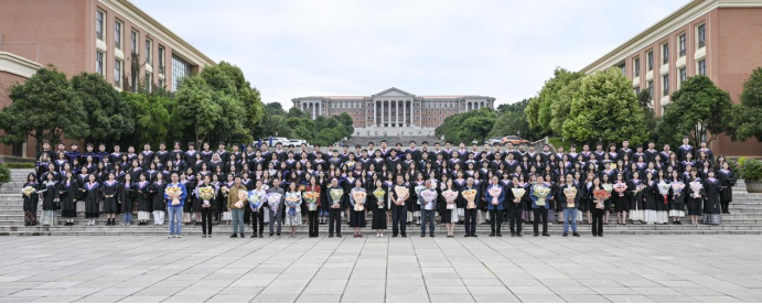 毕业生们身着学位服,于呈贡校区北门龙门道列队拍摄毕业纪念照。