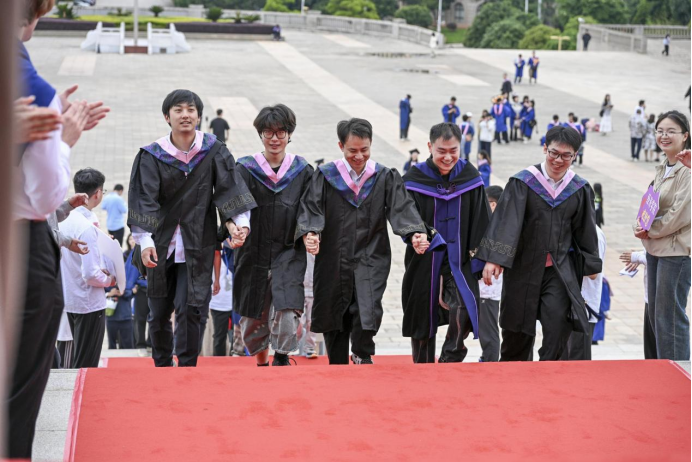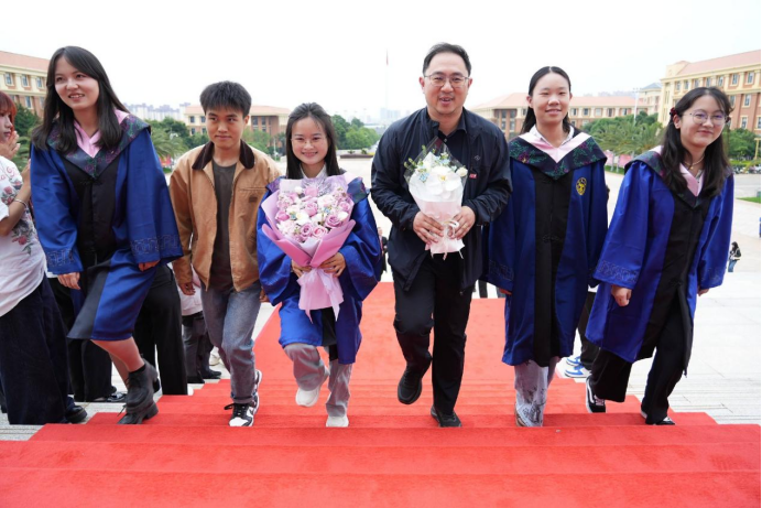 典礼开始前,师生及家长齐聚文典广场,携手踏上红毯。毕业生们与老师、与同窗好、与父母家人同行,依次走过象征着成长与蜕变的红毯。两侧,由学生志愿者组成的欢迎队伍热烈的掌声与欢呼,为毕业生们送上最诚挚的祝愿。