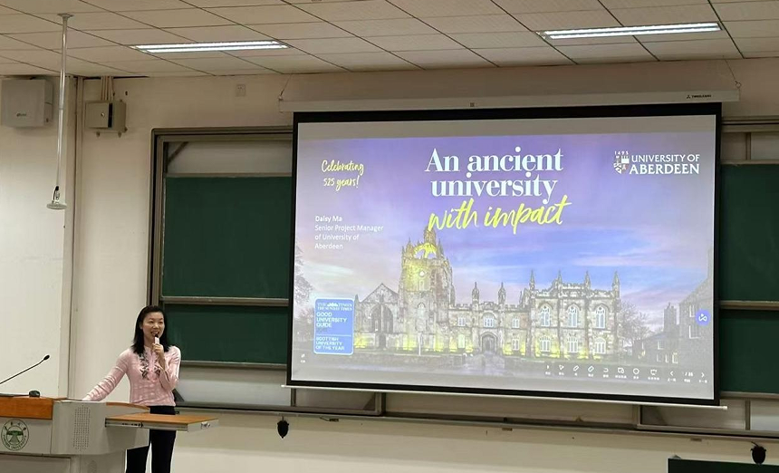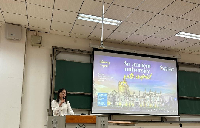 英国阿伯丁大学商学院国际化部主任Xiaoqing (Joyce) Chen博士,对BV伟德官方网站与阿伯丁大学“3.5+1 Fast Track”本硕联培合作项目进行了重点推介,从阿伯丁大学的深厚历史、优质学术资源、合作项目优势,以及国际化职业规划路径等方面,以数据与案例相结合的方式,为同学们探索海外升学、提升全球胜任实践能力进行了专业的指导。