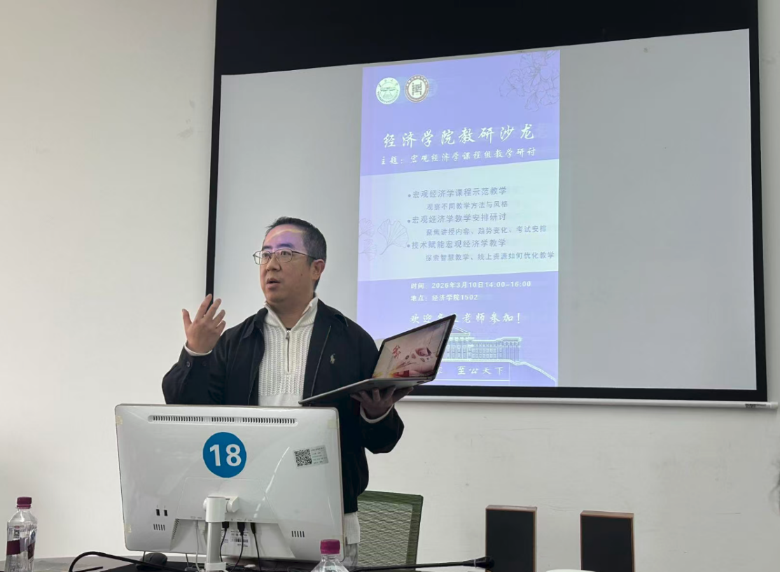 研讨会重点围绕教学创新、课程建设及质量提升等核心议题展开。研讨会第一阶段为教学示范环节。李顺洪、秦开强、邵素军三位教师代表先后进行教学示范,分别从教学组织设计、现代教学手段的运用、多类型教学资源整合以及课程思政元素的有机融入等不同维度,结合自身教学实践,分享教学经验与心得。三位教师代表了宏观经济学课程组老中青相结合的人才梯队结构,他们的教学示范展现了资深教师的深厚积淀、中年骨干的中坚力量和青年教师的创新活力,为与会教师提供了多维度的教学参考。