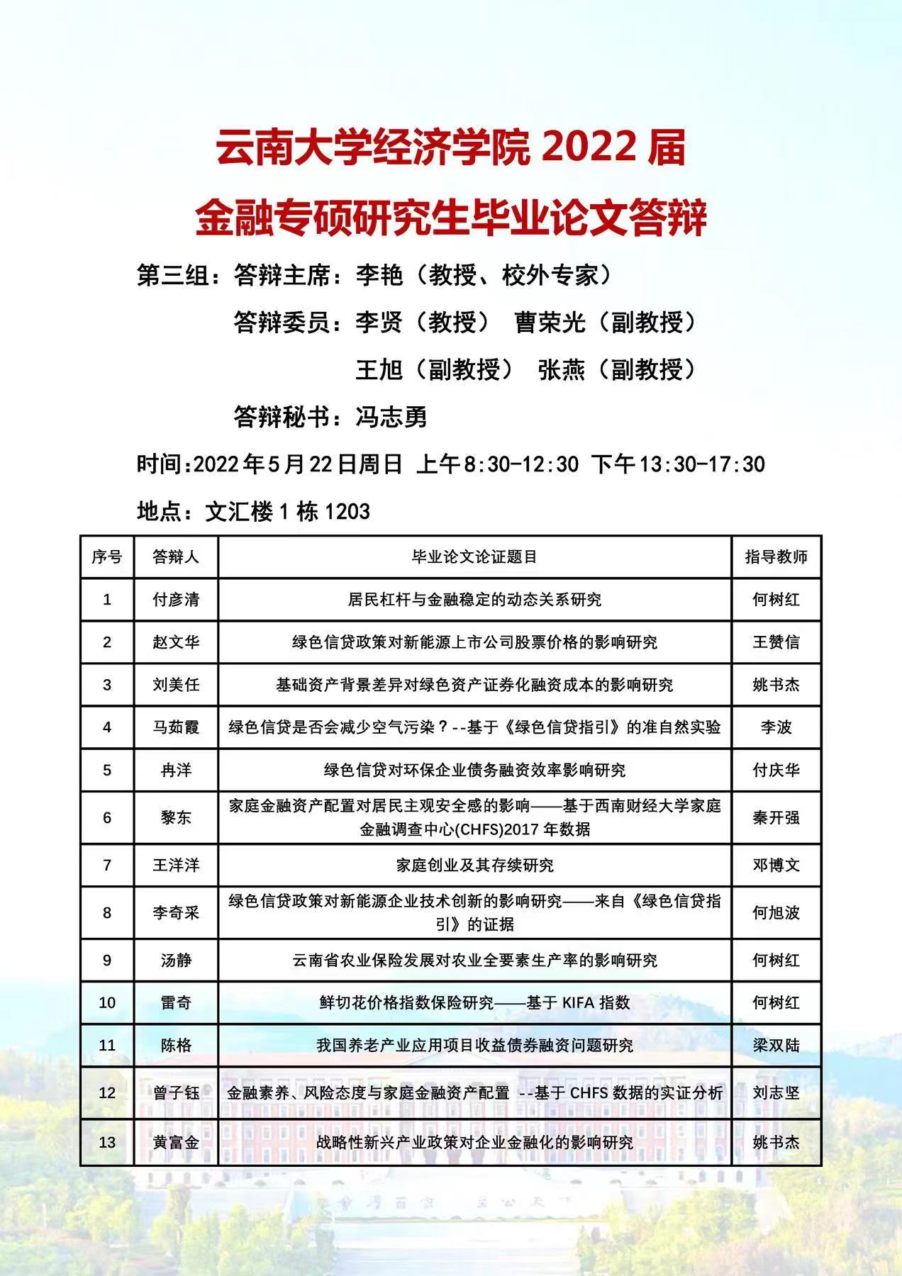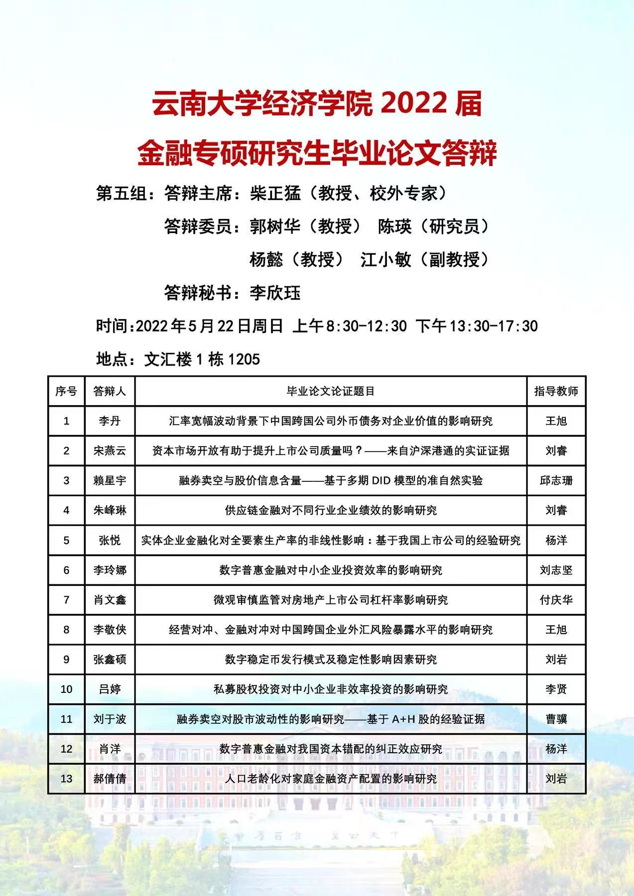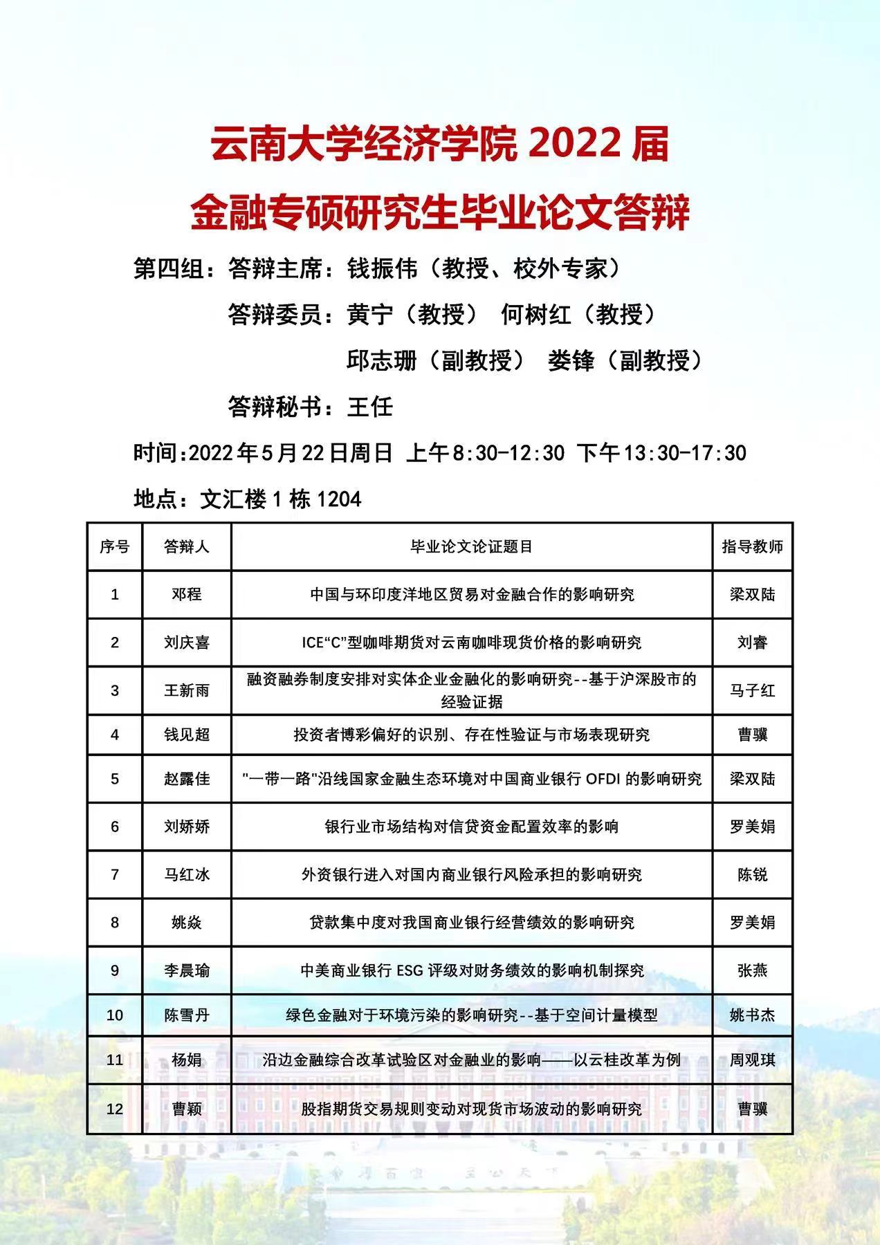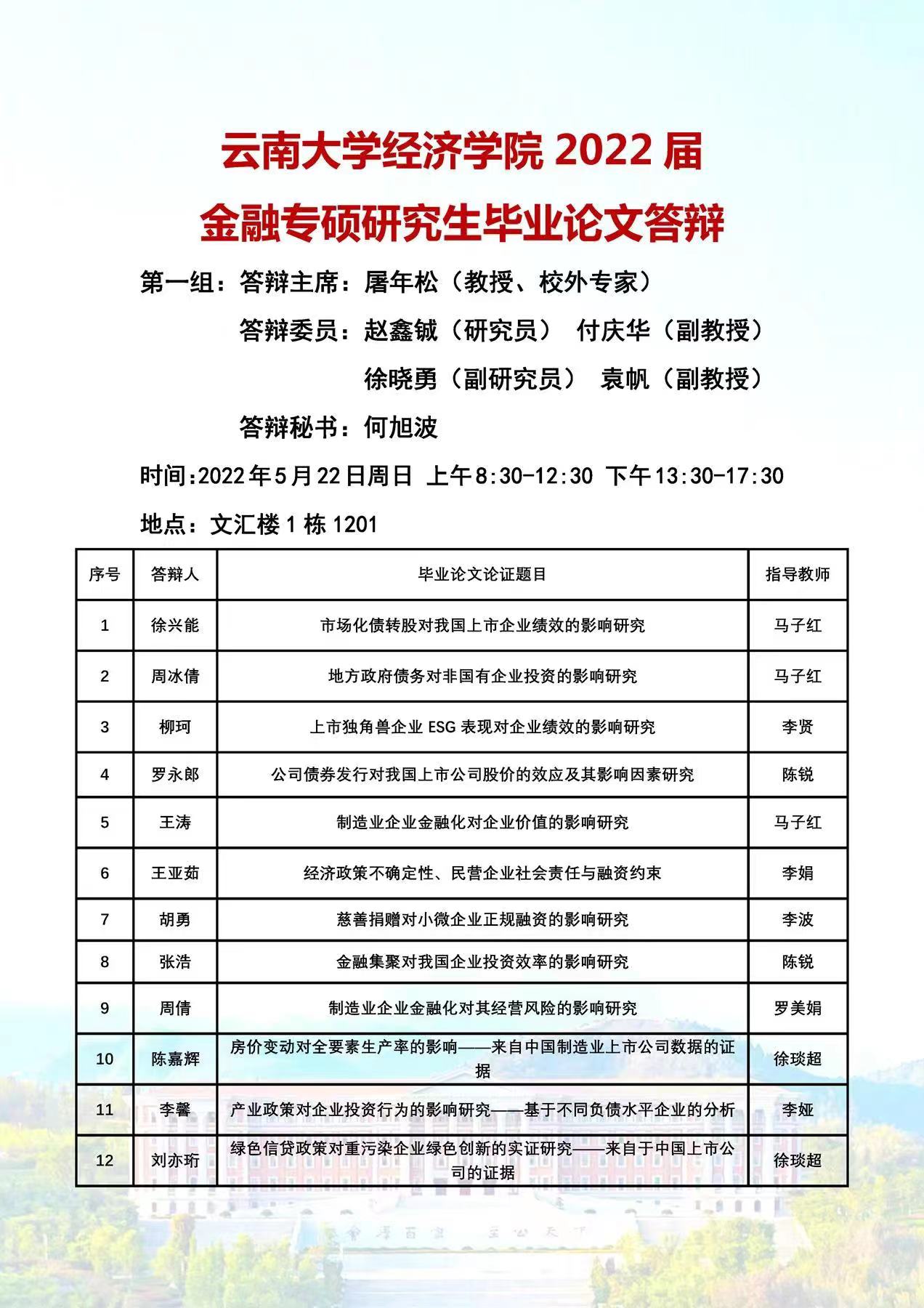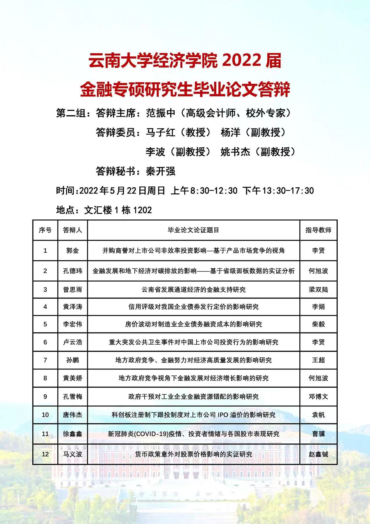 2022届金融专业硕士论文答辩安排