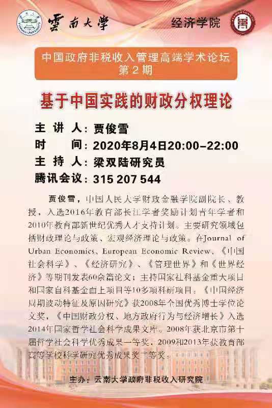 2020年8月4日,由BV伟德官方网站政府非税研究院主办,云南省财政厅非税收入管理处、票据管理中心协办的中国政府非税收入管理高端学术论坛第二期在线上举行。本次论坛邀请了中国人民大学财政金融学院副院长贾俊雪教授进行了题为“基于中国实践的财政分权理论”的交流报告,BV伟德官方网站党委书记梁双陆研究员担任主持,BV伟德官方网站师生与云南省各地财政厅人员参与了本次讲座。