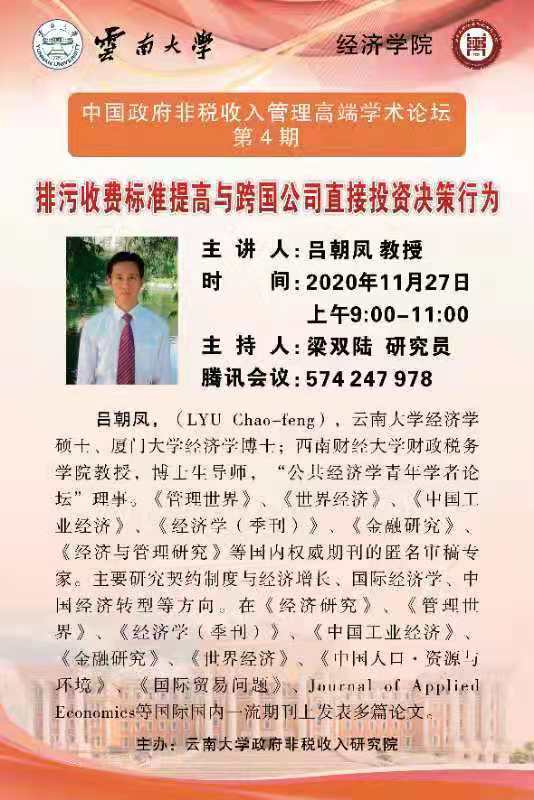 2020年11月27日,由BV伟德官方网站政府非税研究院主办,云南省财政厅非税收入管理处、票据管理中心协办的中国政府非税收入管理高端学术论坛第四期在线上举办。本次论坛邀请了西南财经大学财政税务学院吕朝凤教授进行了题为“当量控制型环境规制强度与跨国公司的直接投资决策行为”的交流报告,BV伟德官方网站党委书记梁双陆研究员担任主持,BV伟德官方网站众师生与云南省各地财政厅参与了本次讲座。