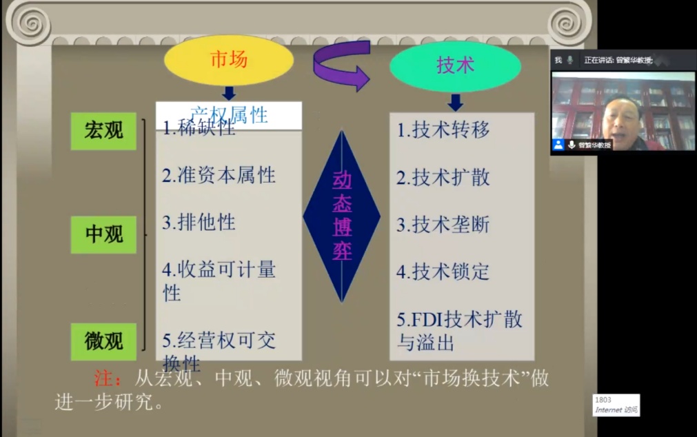 曾繁华教授从1995-2015年GDP增长趋势出发,阐述改革开放后,我国经济增长动力主要依靠投资和要素驱动,总体呈现“重总量轻结构”的特征。当前,我国产业结构亟需转型升级,经济发展需要进行新旧动能转换,以促进经济可持续发展。曾繁华教授通过对比不同经济成分对GDP增长贡献度的演化趋势指出,随着改革开放不断深入,股份制经济、私营和个体经济、外贸投资等非公有制成分对经济发展贡献度呈现增长态势。根据这一情况,有学者提出“以市场换技术”的战略方针。曾繁华教授深入剖析了此战略方针的困境,并对该困境形成的主客观原因、实践恶果和理论进行陈述,创新性的提出从市场产权方面对此问题进行分析。