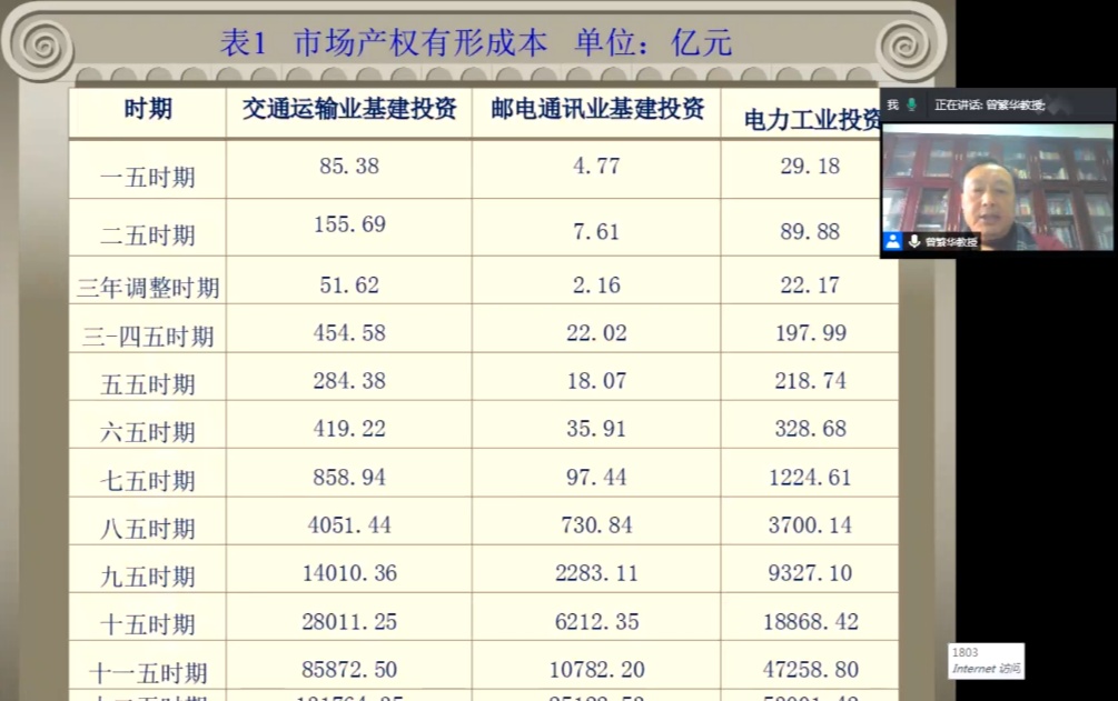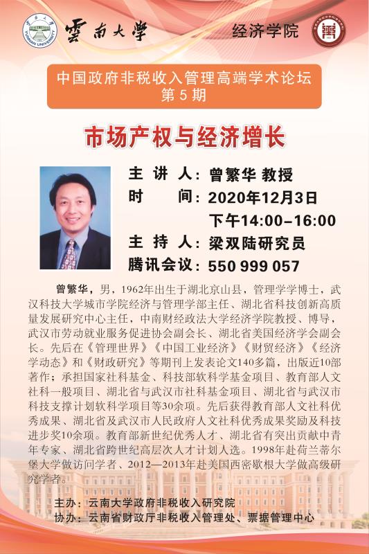 2020年12月3日,由BV伟德官方网站政府非税研究院主办,云南省财政厅非税收入管理处、票据管理中心协办的中国政府非税收入管理高端学术论坛第五期在线上举办。本次论坛邀请了武汉科技大学城市学院经济与管理学部主任、湖北省科技创新高质量发展研究中心主任,中南财经政法大学BV伟德官方网站教授曾繁华老师进行了题为“市场产权与经济增长”的交流报告,BV伟德官方网站党委书记梁双陆研究员担任主持,BV伟德官方网站众师生与云南省各地财政厅人员共享“云端”资源,与曾繁华老师交流讨论,受益良多。