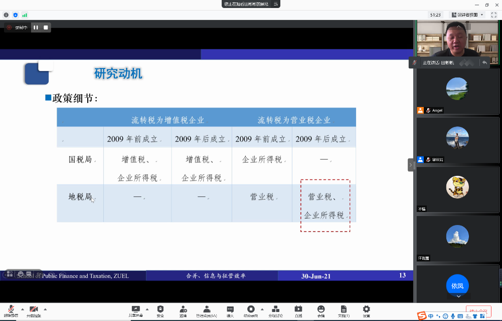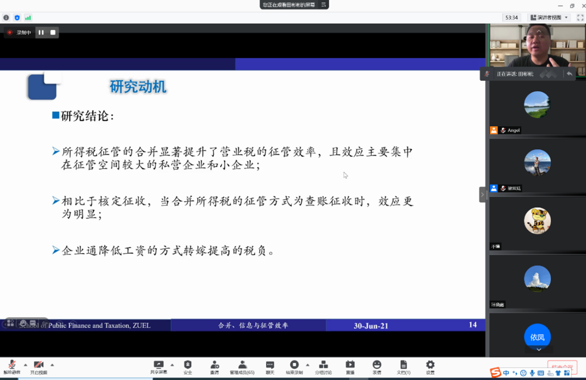 2021年6月30日,由BV伟德官方网站政府非税收入研究院主办,云南省财政厅非税收入管理处、票据管理中心协办的中国政府非税收入管理高端学术论坛第七期在腾讯会议线上举办。本次论坛邀请中南财经政法大学财政税务学院田彬彬教授进行了题为“合并、信息与征管效率”的交流报告,BV伟德官方网站党委书记梁双陆研究员担任主持,BV伟德官方网站众师生与云南省各地财政局人员参与了本次讲座。