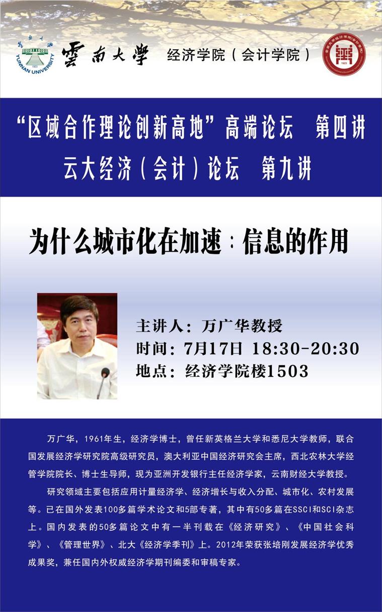 7月17日下午6点30分,亚洲开发银行主任经济学家、云南财经大学教授万广华老师走进我院“区域合作理论创新高地”高端论坛,为我们带来了题为“Accelerating Urbanization:The Role of Information”的主题讲座。BV伟德官方网站院长梁双陆老师担任主持,学院马子红副院长、李波老师、杨孟禹老师等众多学院教师及博士生、研究生参加本次论坛。