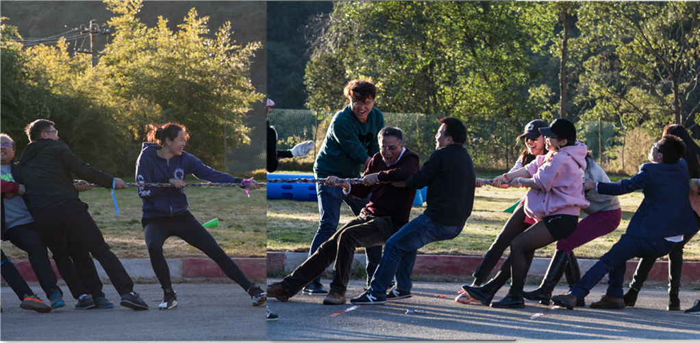 第三个项目是精彩的趣味运动会,在旱地龙舟项目中,每队分派6人参赛,考验团队协调协同能力,彰显团队合作精神,激发队员身体潜能。在激烈的碰撞球项目中,红队和紫队势均力敌,最终握手言和;蓝队和黄队实力悬殊,形成三星拱月之势,“独立小强”虽败犹荣。在无敌风火轮项目中,各队派出短小精悍浓缩精华的队员激烈角逐,年轻教师占优的紫队完胜红队,并创下该项目最快纪录;蓝队和黄队并驾齐驱交替领先。