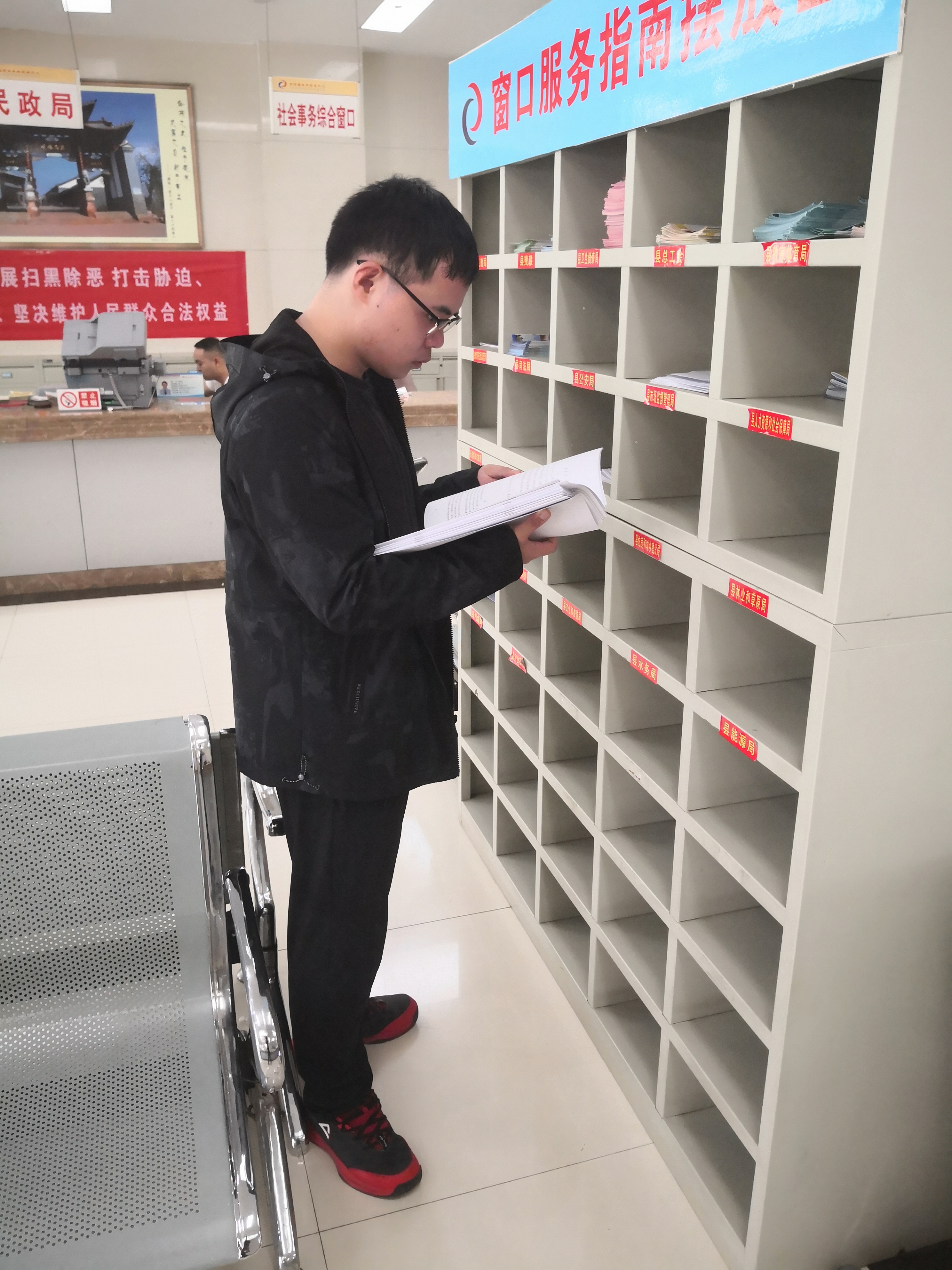 富源县是朱荣江同学的家乡,富源县政务服务管理局位于富源县县城的城中,需要服务的各种各样的人群,工作量巨大,正所谓“基层是最好的课堂,群众是最好的老师”,为了使自己在实践期内掌握一些在学校里无法得到的知识和实用技能。同时也使自己更了解自己家乡的社会民生以及想要为家乡人民服务的强烈愿望。在结合自己各方条件和当地政府的安排后,朱荣江同学来到这里开始了新的征程。