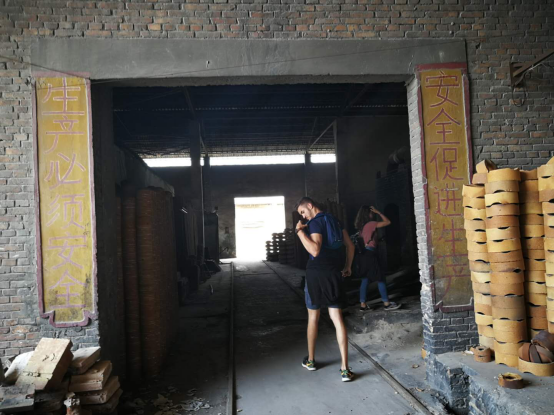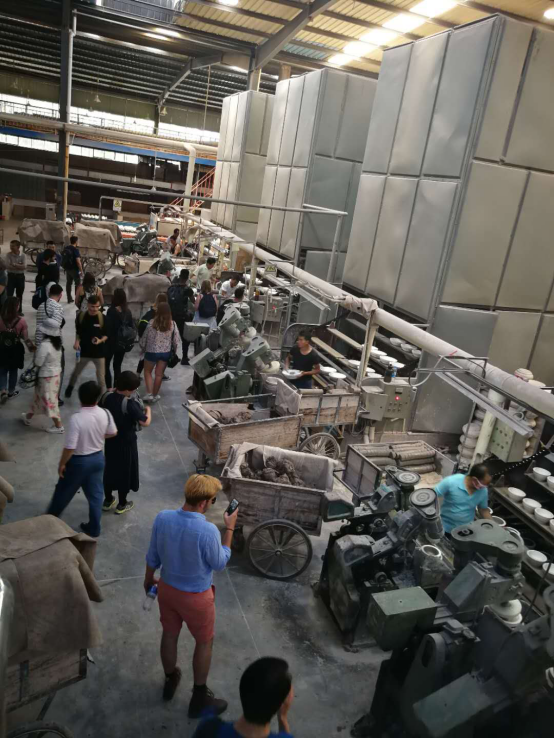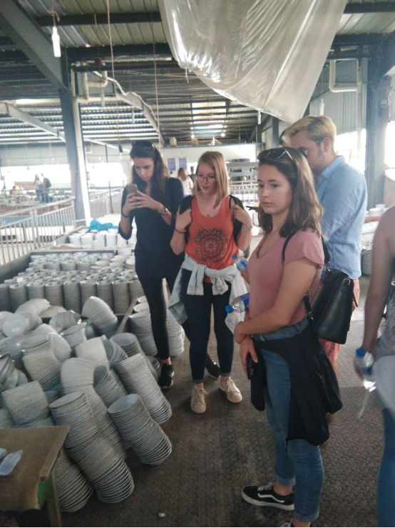 参观完校园后,我们一行踏上了前往瞭浒小镇的大巴。一路上法国同学的热情依旧不减,依然欢歌笑语,不亦乐乎。到达陶瓷小镇后,我们在小镇接待室老师和曲靖师范学院老师的准备和带领下,聆听了有关泛珠江源陶瓷文化课的讲解,虽然全程是英语讲解,但大家都对这份古老的文化很感兴趣并问了很多有趣的问题。之后,我们前往曲靖陶瓷厂观看现代化的陶瓷生产是如何通过流水线逐步完成的,尽管厂内温度很高,但大家对每一道工序都产生了浓厚的兴趣并录下来各类小视频。