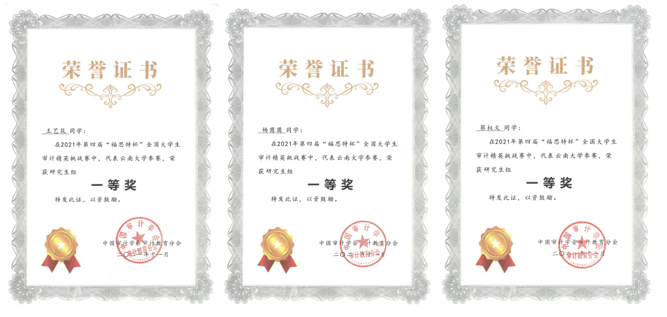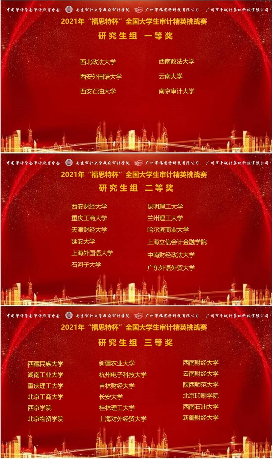 2021 年 11 月 14 日,第四届“福思特杯”全国大学生审计精英挑战赛隆重开幕,本次比赛由中国审计学会审计教育分会主办,南京审计大学政府审计学院承办,广州市福思特科技有限公司提供技术支持。本次大赛分设研究生组、本科生组和高职组。来自南京审计大学、中南财经政法大学、西南财经大学、东北财经大学、天津财经大学、西南政法大学、上海立信会计金融学院、BV伟德官方网站等283所高校的330支队伍,共计1600余名师生参加了本次比赛。经过紧张激烈角逐,我院2020级审计专硕代表队取得“一等奖”的佳绩。