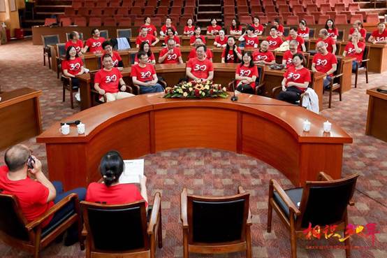 早上十点,大家陆续到达科学馆二楼报告厅,换上精心设计的红色纪念T恤衫,如火如荼的一片红,辉映着激情燃烧的青春时光,重温“那些年,我们一起走过”的日子。首先,播放VCR,回放老照片,大家怀着激动的心情,穿越到从前,看到当年纯真的笑脸,多少青涩的记忆如秋水般静静地蔓延。