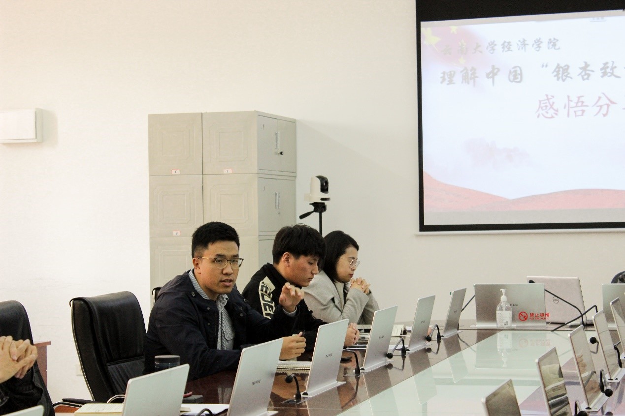 互动交流中,徐琰超老师通过将经济学知识与大国信仰中的部分内容相结合,为大家阐述了中国社会主义制度的不断完善与发展在中国经济建设中起到了怎样的重要作用,并强调了我国实现共同富裕的决心,引导同学们深入思考。徐琰超老师的对读书会的分享总结使同学们受益匪浅:首先,应当学会思辨,用辩证发展的眼光看待事物,善于思考,从不同角度发现事物的本质。其次,要注重实践,实践是检验真理的唯一标准。最后,作为一名研究生,在科研方面一定要学会刻苦努力,中国今日之成就离不开夜以继日的科研工作者的辛勤付出。