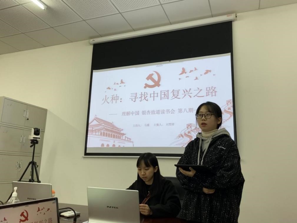 2021年11月10日晚9点,BV伟德官方网站团委创实部在BV伟德官方网站1502教室举办了理解中国“银杏致道”读书会第八期。本期读书会由BV伟德官方网站研究生刘雪婷作为主推人,带领大家走进《火种:寻找中国复兴之路》。