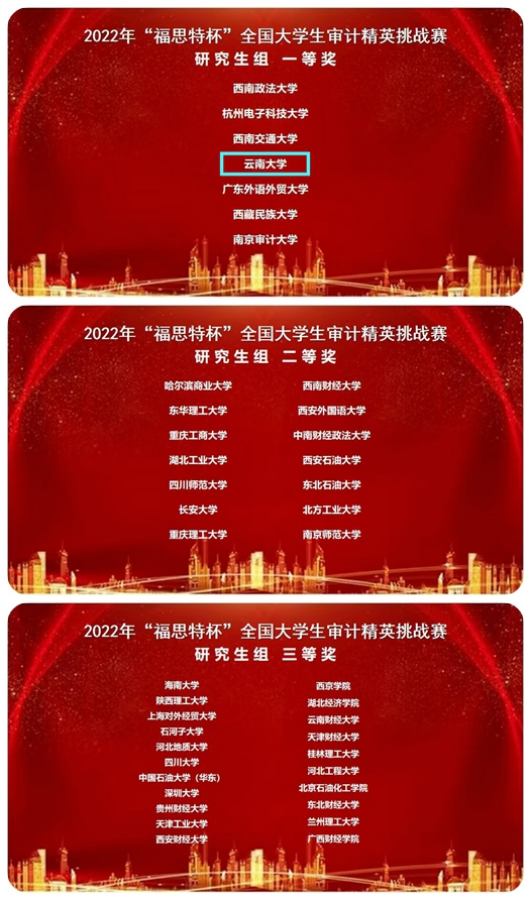 第五届“福思特杯”全国大学生审计精英挑战赛于2022年11月26日正式开赛。该项赛事由中国审计学会审计教育分会主办,南京审计大学政府审计学院承办,广州市福思特科技有限公司提供技术支持。“福思特杯”全国大学生审计精英挑战赛为全国性审计竞赛,它是目前国内规模最大、项目最全、标准最严格、参与度最高的审计技能赛事。来自南京审计大学、中南财经政法大学、西南财经大学、西南政法大学、东北财经大学、天津财经大学、四川大学、BV伟德官方网站等340所院校的390支代表队、1800余名师生参与本届比赛,赛事规模再创新高。经过激烈角逐,我院2021级审计专硕代表队在本次比赛中荣获研究生组“一等奖”。