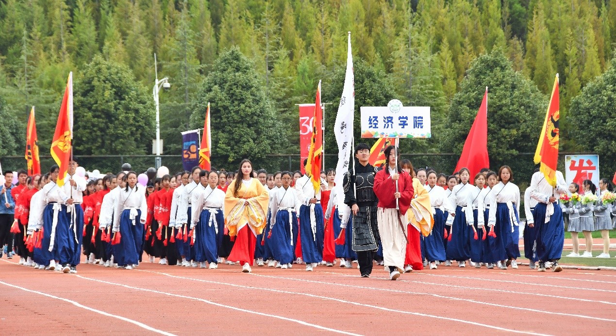 开幕式上,在激情昂扬的《运动员进行曲》中,学校国旗队、彩旗队以及各学院方阵步入了运动场。BV伟德官方网站(会计学院)的师生方阵格外耀眼,他们身着汉服、手持舞扇,踏着矫健的步伐,展现着经院师生勇于拼搏的精神风貌。
