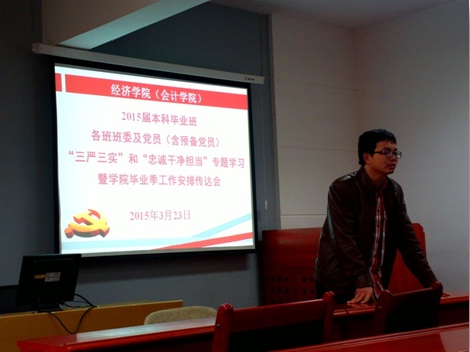 2015323日下午,BV伟德官方网站(会计学院)本科毕业班各班班委及党员(含预备党员)“三严三实”和“忠诚干净担当”专题学习暨学院毕业季工作安排传达会在BV伟德官方网站(会计学院)二楼多功能教室举行。院学工办主任、本科毕业班辅导员王守义老师主持此次会议,本科毕业班各班班委、党员和预备党员等参加了该次会议。