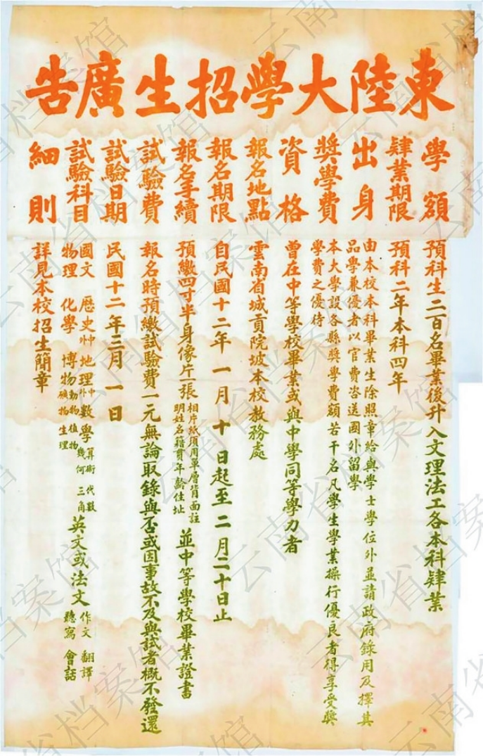 图为:周钟嶽书写的第一期东陆大学招生广告