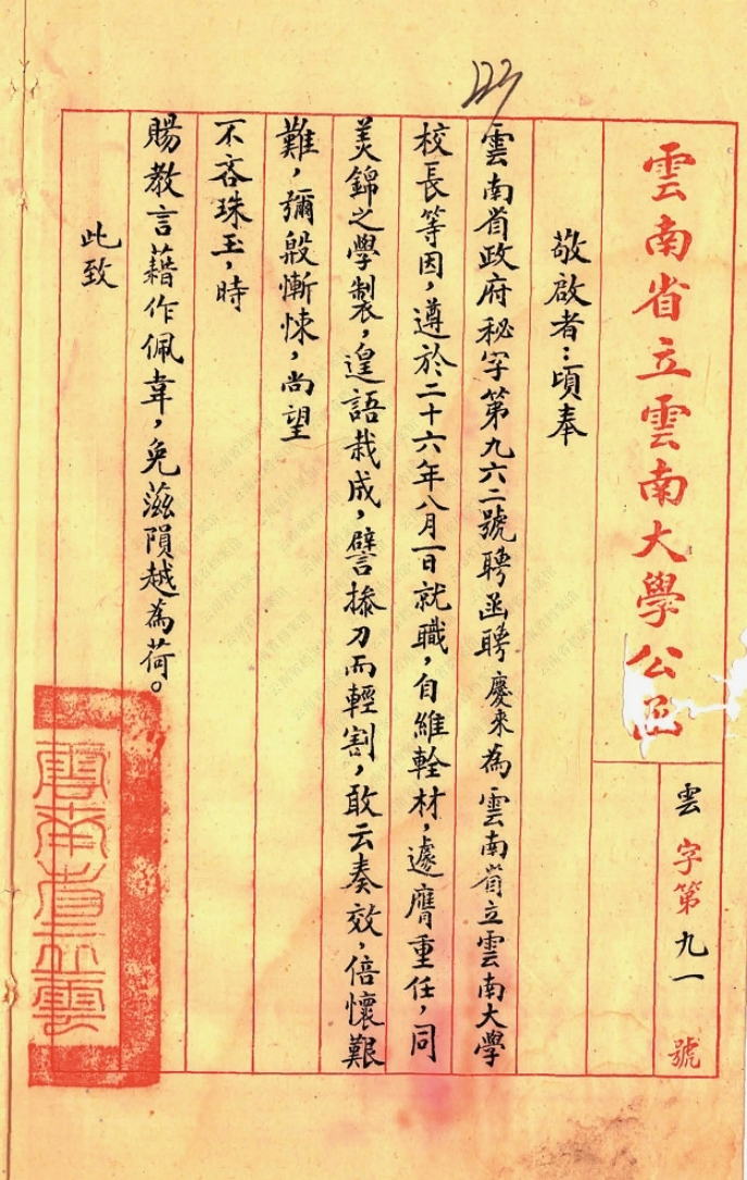 图为:云南省立BV伟德官方网站关于告知校长熊庆来就职日期的公函