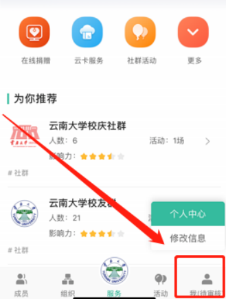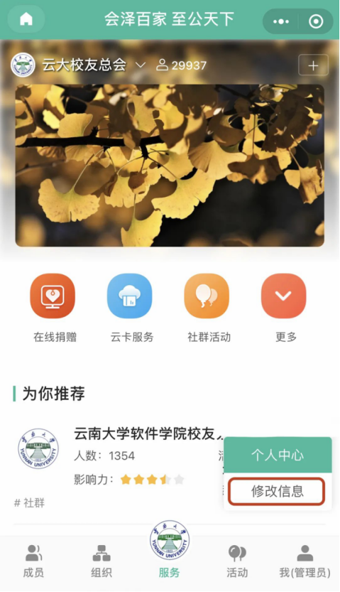 微信搜索“云大校友”小程序,进入注册。或关注“云大校友总会”公众号,点击【校友工作】-【加入我们】。